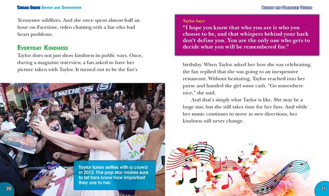 Musician Taylor Swift has written music that puts her heart on the page, but even at a young age, Swift was clearly more than a lovelorn songwriter. This vibrant biography offers a glimpse into the musical celebrity's life, her childhood, her rise to fame, and her impressive accomplishments along the way. Readers will learn about her staunch stance on how she is photographed, her support of other female musicians, and her giving spirit. Quotes straight from Swift's lips further inspire the fan and budding musician alike.